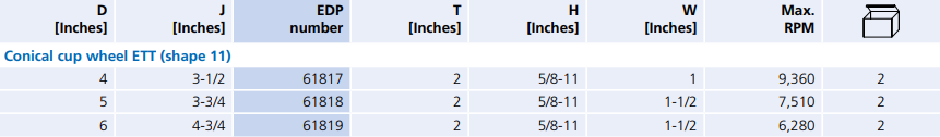 Type: Cup Wheel | Diameter (in.): 5 | Thickness (in.): 2 | Diameter J (in.): 3-3/4 | Arbor Hole (in.): 5/8 - 11 | Shape: Conical | Wheel Type: Shape 11 | RPM: 7510 | Abrasive Material: Zirconia alumina Z