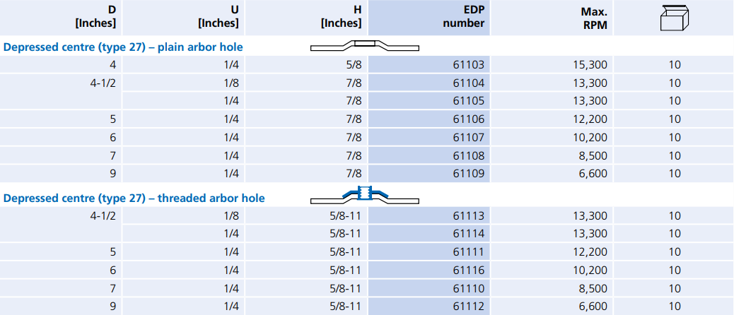 Type: Grinding Wheel | Diameter (in.): 9 | Thickness (in.): 1/4 | Arbor Hole (in.): 5/8-11 | Arbor Hole Type: Threaded | Wheel Type: Type 27 | RPM: 6600 | Abrasive Material: Aluminum Oxide A