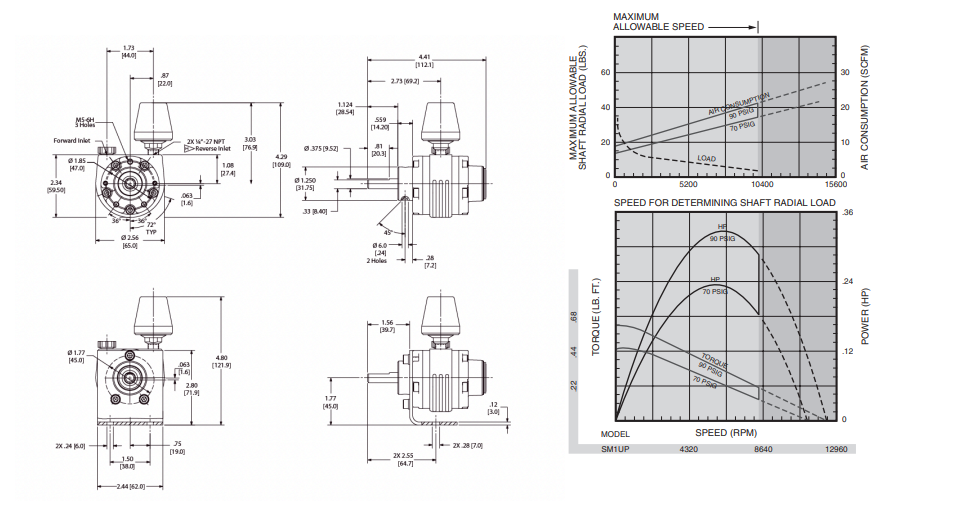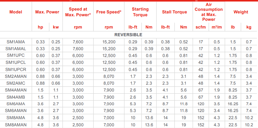 Type: Air Motor | Power (HP): 0.6 | Power (kw): 0.37 | Speed @ Max Power (RPM): 6000 | Free Speed (RPM): 12500 | Starting Torque (lb-ft): 0.45 | Starting Torque (Nm): 0.6 | Stall Torque (lb-ft): 0.6 | Stall Torque (Nm): 0.81 | Air Consumption @ Max Power (SCFM): 42 | Air Consumption @ Max Power (m³/m): 1.2