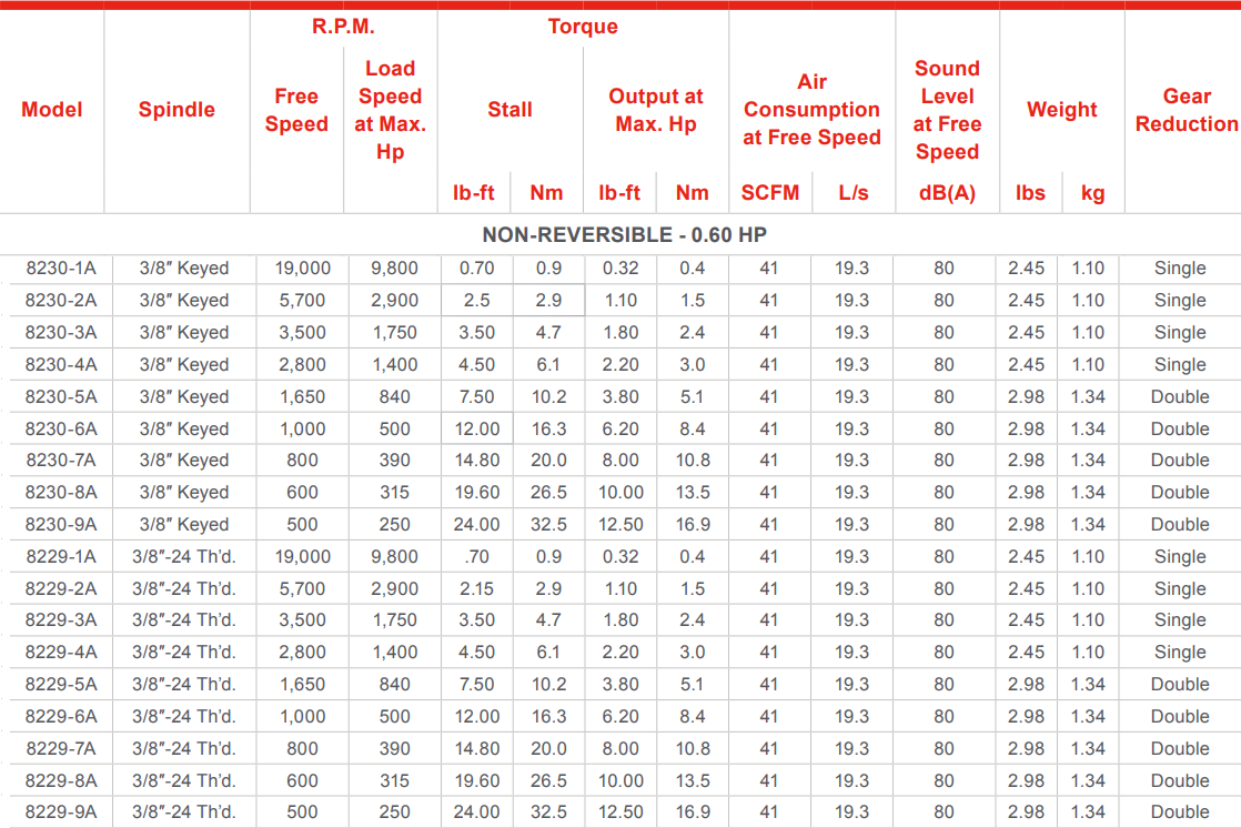 Type: Air Motor | Spindle Thread (in.): 3/8-24 | Free Speed (RPM): 1000 | Load Speed @ Max HP (RPM): 500 | Stall Torque (ft-lbs): 12.00 | Stall Torque (Nm): 16.3 | Torque Output @ Max HP (ft-lbs): 6.20 | Torque Output @ Max HP (Nm): 8.4 | Air Consumption @ Free Speed (SCFM): 41 | Air Consumption @ Free Speed (l/s): 19.3 | Sound Level @ Free Speed (dbA): 80 | Gear Reduction: Double