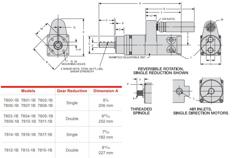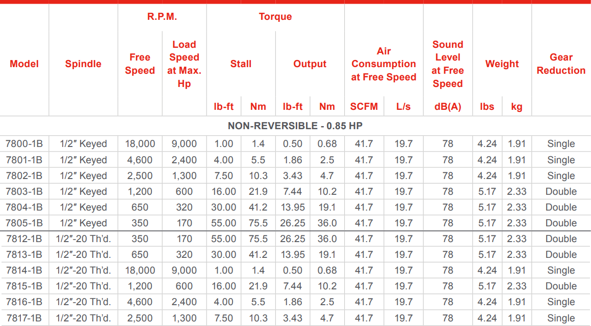 Type: Air Power Motor | Motor Type: Non-Reversible | Power (HP): 0.85 | Spindle Keyed (in.): 1/2 | Free Speed (RPM): 4600 | Load Speed @ Max HP (RPM): 2400 | Stall Torque (ft-lbs): 4 | Stall Torque (Nm): 5.5 | Torque Output @ Max HP (ft-lbs): 1.86 | Torque Output @ Max HP (Nm): 2.5 | Air Consumption @ Free Speed (SCFM): 41.7 | Air Consumption @ Free Speed (l/s): 19.7 | Sound Level @ Free Speed (dbA): 78 | Gear Reduction: Single