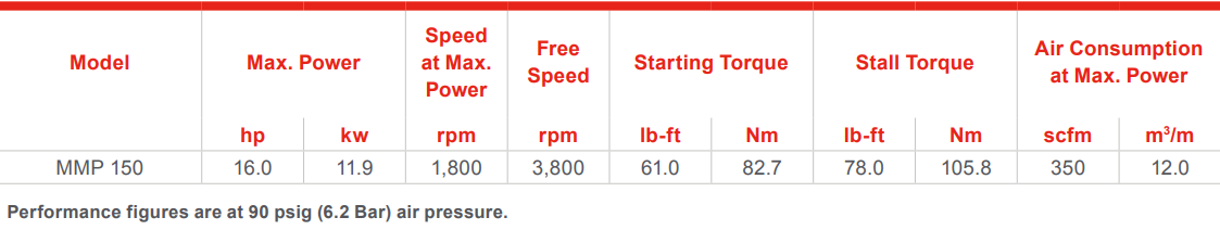 Type: Air Motor | Max Power (HP): 16.0 | Max Power (kw): 11.9 | Speed @ Max Power (RPM): 1,800 | Free Speed (RPM): 3,800 | Starting Torque (lb-ft): 61.0 | Starting Torque (Nm): 82.7 | Stall Torque (lb-ft): 78.0 | Stall Torque (Nm): 105.8 | Air Consumption @ Max Power (SCFM): 350 | Air Consumption @ Max Power (m³/m): 12.0