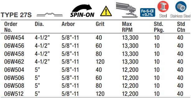 Type: Flap Disc | Diameter (in.): 5 | Arbor Hole (in.): 5/8 - 11 | Grit: 80 | RPM: 12200 | Disc Type: Type 27S | Abrasive Material: Zirconia Alumina | Sold by Box of: 10 | __quantity: 10