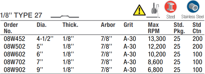 Type: Grinding Wheel | Diameter (in.): 4-1/2 | Arbor Hole (in.): 7/8 | Thickness (in.): 1/8 | Grade: A-30 | RPM: 13300 | Wheel Type: Type 27 | Sold by Box of: 25 | __quantity: 25