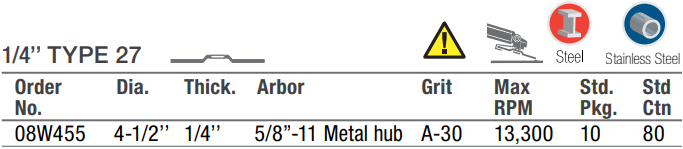 Type: Grinding Wheel | Diameter (in.): 4-1/2 | Arbor Hole (in.): 5/8-11 (Metal Hub) | Thickness (in.): 1/4 | Grade: A-30 | RPM: 13300 | Wheel Type: Type 27S | Sold by Box of: 10 | __quantity: 10