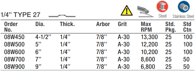 Type: Grinding Wheel | Diameter (in.): 5 | Arbor Hole (in.): 7/8 | Thickness (in.): 1/4 | Grade: A-30 | RPM: 12200 | Wheel Type: Type 27 | Sold by Box of: 25 | __quantity: 25