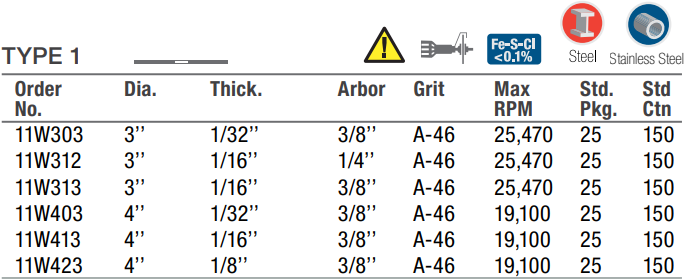 Type: Cut-Off Wheel | Diameter (in.): 4 | Arbor Hole (in.): 3/8 | Thickness (in.): 1/16 | Grade: A-46 | RPM: 19100 | Wheel Type: Type 1 | Sold by Box of: 25 | __quantity: 25