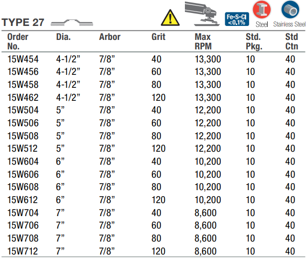 Type: Flap Disc | Diameter (in.): 6 | Arbor Hole (in.): 7/8 | Grit: 120 | RPM: 10200 | Disc Type: Type 27 | Abrasive Material: Zirconia Alumina | Sold by Box of: 10 | __quantity: 10
