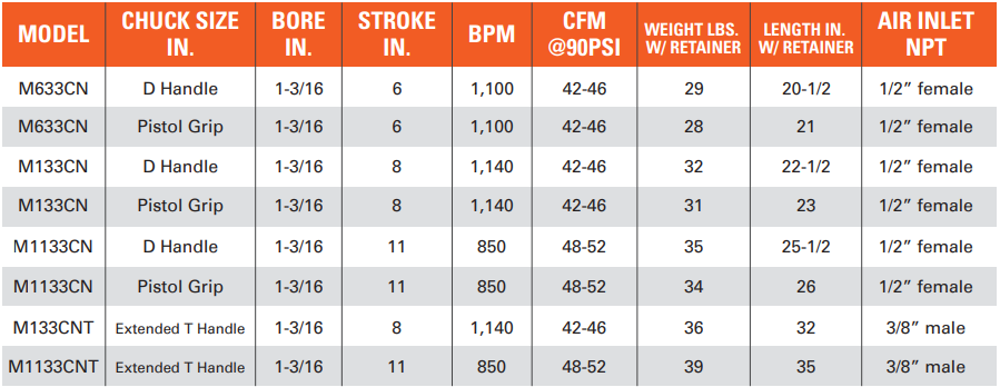 Type: Rivet Buster | Handle: D Handle | Bore (in.): 1-3/16 | Stroke (in.): 11 | BPM: 850 | Air Consumption @ 90 PSI (CFM): 48-52 | Length W/Retainer (in.): 25-1/2 | Air Inlet NPTF (in.): 1/2 | Application: Bridge Repair, Tank and Boiler Maintenance