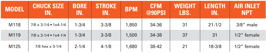 Type: Clay Digger | Hex Size (in.): 7/8 | Chuck Size (in.): 3-1/4 | Bore (in.): 2-1/4 | Stroke (in.): 4-1/8 | BPM: 1680 | Air Consumption @ 90 PSI (CFM): 38-42 | Length (in.): 18-3/8 | Air Inlet NPTF (in.): 1/2 | Application: Road repair, Maintenance, and General Earth removal tasks