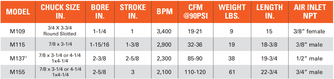 Type: Rock Drill | Chuck (in.): 7/8 x 3-1/4 | Bore (in.): 2-3/8 | Stroke (in.): 2-5/8 | BPM: 2300 | Air Consumption @ 90 PSI (CFM): 85-90 | Length (in.): 19-3/4 | Air Inlet NPT (in.): 1/2 Male | Application: Utility and maintenance drilling tasks