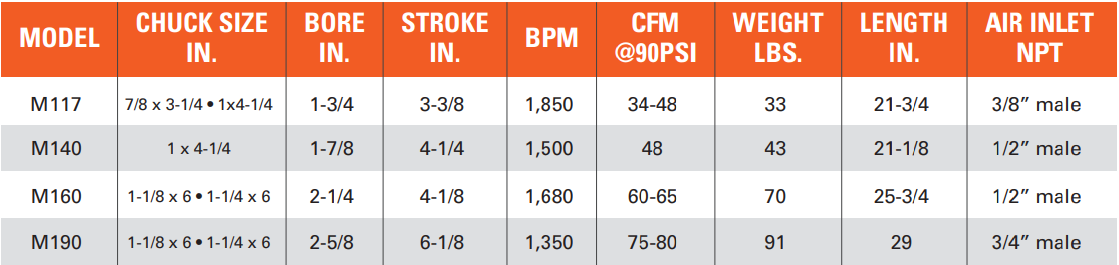 Type: Paving Breaker | Chuck (in.): 1-1/4 x 6 | Bore (in.): 2-5/8 | Stroke (in.): 6-1/8 | BPM: 1350 | Air Consumption @ 90 PSI (CFM): 75-80 | Length (in.): 29 | Air Inlet NPT (in.): 3/4 Male | Application: Breaking and Removing Concrete Slabs, Sidewalks, and Pavement