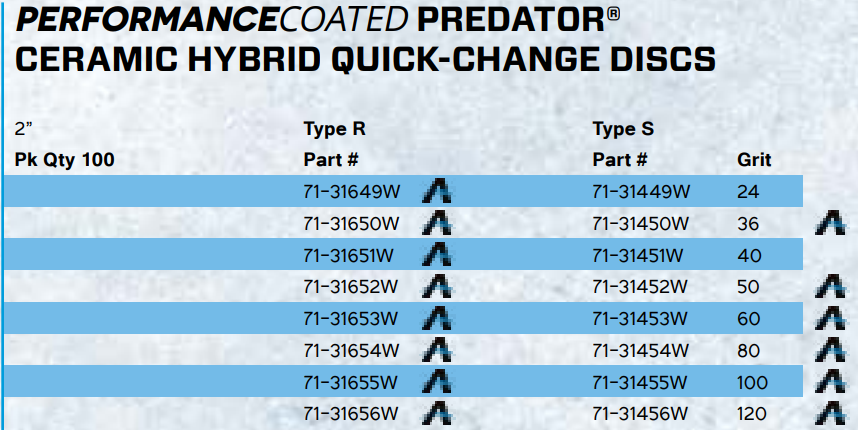 Type: Quick Lok Disc | Structure: Cloth | Mineral: Ceramic Blend | Product Line: Predator (Ceramic Hybrid) | Diameter (in.): 2 | Grit: 80 | Max RPM: 25000 | Application: Blending, Deburring, Stock Removal | Surface Types: Aluminum, Exotic Alloys, Mild Steel, Stainless Steel | Performance Coat: Yes | Box of: 100 | __quantity: 100
