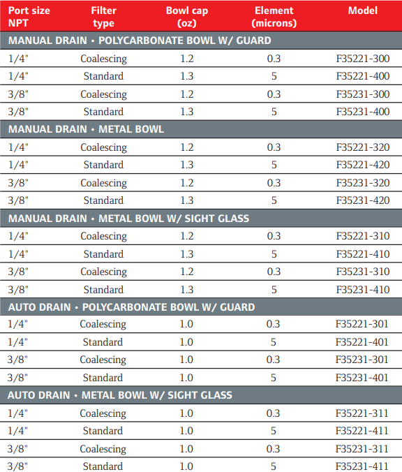 Type: Filter | Port Size (in.): 1/4 NPT | Drain Type: Manual | Bowl Type: Polycarbonate Bowl with Guard | Filter Type: Standard | Filter Element: 5 Micron | Bowl Cap (oz.): 1.3 | Max Inlet Pressure (PSI): 150 | Temperature Range (F): 23 - 125 | Flow Capacity (SCFM): 73
