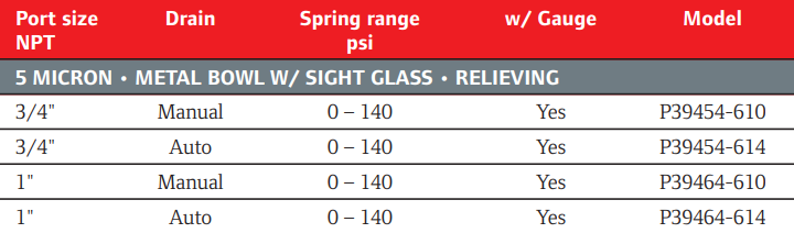 Type: Filter-Regulator | Port Size (in.): 3/4 NPT Thread | Drain Type: Manual | Bowl Type: Metal with Sight Glass | Filter Element: 5 Micron | Bowl Cap (oz.): 5.3 | Spring Range Options (PSI): 0 - 140 | Maximum Inlet Pressure (PSI): 250 | Temperature Range (F): 23 - 175 | Flow Capacity (SCFM): 236