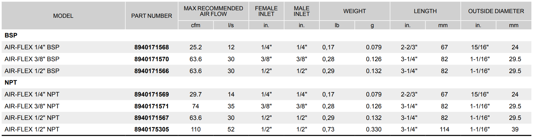Type: Flex Fitting | Length (in.): 3-1/4 | Length (mm): 82 | Air Inlet NPTF (in.): 3/8 | Air Inlet Size (in.): 3/8 | Max Recommended Air Flow (CFM): 74 | Max Recommended Air Flow (l/s): 35 | Outside Diameter (in.): 1-1/16 | Outside Diameter (mm): 29.5