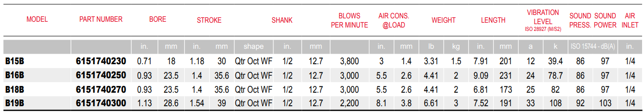 Type: Chipping Hammer | Blows Per Minute (BPM): 3000 | Length (in.): 9.09 | Length (mm): 231 | Vibration Level (a): 24 | Vibration Level (k): 78.7 | Sound Pressure (dbA): 86 | Sound Power (dbA): 97 | Air Inlet Size (in.): 1/4 | Bore (in.): 0.93 | Bore (mm): 23.5 | Stroke (in.): 1.4 | Stroke (mm): 35.6 | Min Hose Size (in.): 3/8 | Min Hose Size (mm): 10 | Shank Shape: Qtr Oct WF | Shank (in.): 1/2 | Shank (mm): 12.7