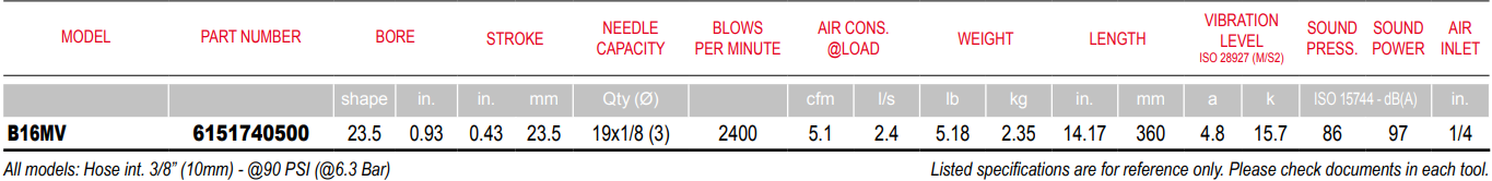 Type: Needle Scaler | Blows Per Minute (BPM): 2400 | Length (in.): 14.7 | Length (mm): 360 | Air Consumption @ Load (CFM): 5.1 | Air Consumption @ Load (l/s): 2.4 | Vibration Level (a): 4.8 | Vibration Level (k): 15.7 | Sound Pressure (dbA): 86 | Sound Power (dbA): 97 | Air Inlet Size (in.): 1/4 | Bore Size: 23.5 | Bore (in.): 0.93 | Stroke (in.): 0.43 | Stroke (mm): 23.5 | Needle Capacity (in.): 19x1/8 (3) | Min Hose Size (in.): 3/8 | Min Hose Size (mm): 10