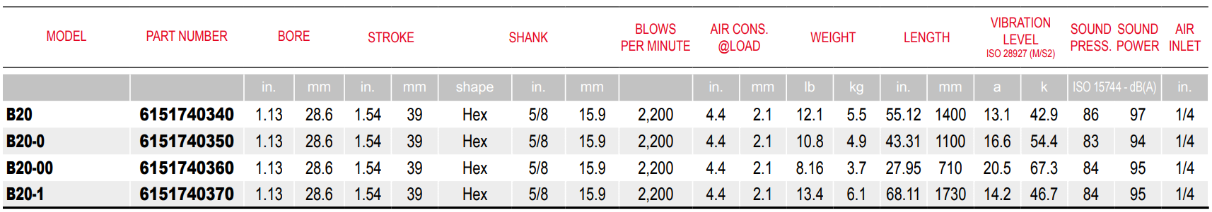 Type: Scaler | Blows Per Minute (BPM): 2200 | Length (in.): 43.31 | Length (mm): 1100 | Vibration Level (a): 16.6 | Vibration Level (k): 54.4 | Sound Pressure (dbA): 83 | Sound Power (dbA): 94 | Air Inlet Size (in.): 1/4 | Bore (in.): 1.13 | Bore (mm): 28.6 | Stroke (in.): 1.54 | Stroke (mm): 39 | Min Hose Size (in.): 3/8 | Min Hose Size (mm): 10 | Shank Shape: Hex | Shank (in.): 5/8 | Shank (mm): 15.9