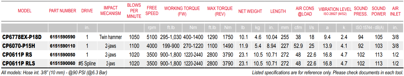 Type: Impact Wrench | Drive Size (in.): 1 | Impact Mecanism: 2-jaws | Blows Per Minute (BPM): 1020 | Free Speed (RPM): 3500 | Working Torque Range (ft-lbs): 900-1,800 | Working Torque Range (fwd) (Nm): 1220-2440 | Max Reverse Torque (ft-lbs): 2800 | Max Reverse Torque (Nm): 3790 | Length (in.): 10.71 | Length (mm): 272 | Air Consumption @ Load (CFM): 48 | Air Consumption @ Load (l/s): 22.6 | Vibration Level (a): 16.8 | Vibration Level (k): 4.7 | Sound Pressure (dbA): 102 | Sound Power (dbA): 113 | Air Inlet Size (in.): 1/2 | Min Hose Size (in.): 3/8 | Min Hose Size (mm): 10