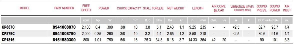 Type: Construction Drill | Free Speed (RPM): 800 | Length (in.): 14.33 | Length (mm): 364 | Air Consumption @ Load (CFM): 42 | Air Consumption @ Load (l/s): 20 | Sound Pressure (dbA): 90 | Sound Power (dbA): 101 | Air Inlet Size (in.): 3/8 | Power (HP): 1.01 | Power (W): 750 | Collet Capacity (in.): 5/8 | Collet Capacity (mm): 16 | Min Hose Size (in.): 3/8 | Min Hose Size (mm): 10 | Stall Torque (ft-lbs): 25.3 | Stall Torque (Nm): 34.3