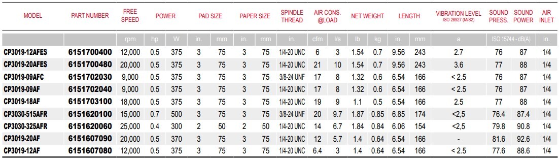 Type: Angle Sander | Free Speed (RPM): 15000 | Length (in.): 6.85 | Length (mm): 174 | Air Consumption @ Load (CFM): 20 | Air Consumption @ Load (l/s): 9.7 | Vibration Level (a): <2.5 | Sound Pressure (dbA): 76.4 | Sound Power (dbA): 87.4 | Air Inlet Size (in.): 1/4 | Power (HP): 0.7 | Power (W): 500 | Pad Size (in.): 3 | Pad Size (mm): 75 | Paper Size (in.): 3 | Paper Size (mm): 75 | Spindle Thread (in.): 3/8-24 UNF | Min Hose Size (in.): 3/8 | Min Hose Size (mm): 10