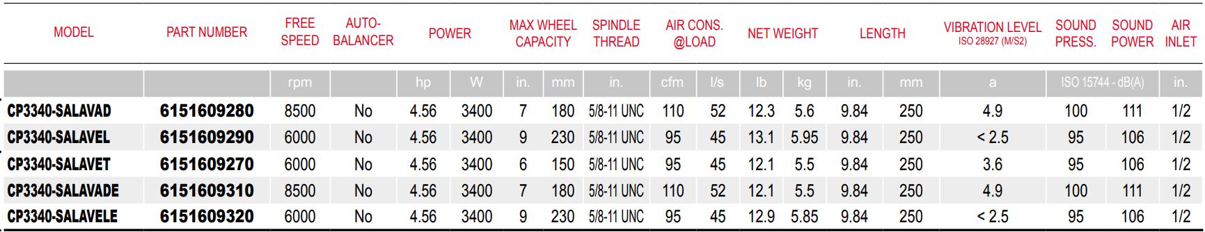 Type: Vertical Grinder | Free Speed (RPM): 8500 | Length (in.): 9.84 | Length (mm): 250 | Air Consumption @ Load (CFM): 110 | Air Consumption @ Load (l/s): 52 | Vibration Level (a): 4.9 | Sound Pressure (dbA): 100 | Sound Power (dbA): 111 | Air Inlet Size (in.): 1/2 | Power (HP): 4.56 | Power (W): 3400 | Spindle Thread (in.): 5/8-11 UNC | Max Wheel Capacity (in.): 7 | Min Hose Size (in.): 3/8 | Min Hose Size (mm): 10 | Auto Balancer: No