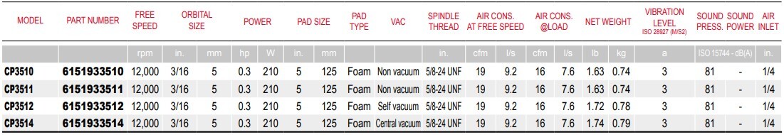 Type: Random Orbital Sander | Free Speed (RPM): 12000 | Air Consumption @ Free Speed (CFM): 19 | Air Consumption @ Free Speed (l/s): 9.2 | Air Consumption @ Load (CFM): 16 | Air Consumption @ Load (l/s): 7.6 | Vibration Level (a): 3 | Sound Pressure (dbA): 81 | Air Inlet Size (in.): 1/4 | Power (HP): 0.3 | Power (W): 210 | Pad Size (in.): 5 | Pad Size (mm): 125 | Pad Type: Foam | Vacuum: Self vacuum | Spindle Thread (in.): 5/8-24 UNF | Min Hose Size (in.): 3/8 | Min Hose Size (mm): 10 | Orbit Size (in.): 3/16 | Orbit Size (mm): 5