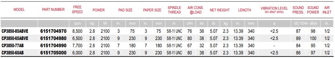 Type: Angle Sander | Free Speed (RPM): 7700 | Length (in.): 13.39 | Length (mm): 340 | Air Consumption @ Load (CFM): 67 | Air Consumption @ Load (l/s): 32 | Vibration Level (a): - | Sound Pressure (dbA): 84 | Sound Power (dbA): 95 | Air Inlet Size (in.): 1/2 | Power (HP): 2.8 | Power (W): 2100 | Pad Size (in.): 7 | Pad Size (mm): 180 | Paper Size (in.): 9 | Paper Size (mm): 230 | Spindle Thread (in.): 5/8-11 UNC | Min Hose Size (in.): 3/8 | Min Hose Size (mm): 10