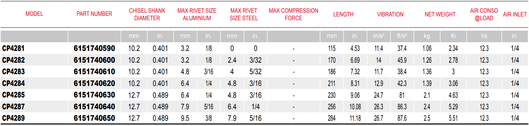 Type: Rivet Hammer | Length (in.): 4.53 | Length (mm): 115 | Air Consumption @ Load (l/s): 12.3 | Vibration (m/s²): 11.4 | Air Inlet Size (in.): 1/4 | Min Hose Size (in.): 3/8 | Min Hose Size (mm): 10 | Chisel Shank Diameter (mm): 10.2 | Chisel Shank Diameter (in.): 0.401 | Max Rivet Size Aluminum (mm): 3.2 | Max Rivet Size Aluminum (in.): 1/8