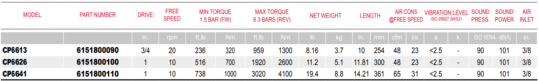 Type: Nutrunner | Drive Size (in.): 3/4 | Free Speed (RPM): 20 | Max Reverse Torque (ft-lbs): 959 (6.3 BARS) | Max Reverse Torque (Nm): 1300 | Length (in.): 10 | Length (mm): 254 | Air Consumption @ Free Speed (CFM): 48 | Air Consumption @ Free Speed (l/s): 23 | Vibration Level (a): <2.5 | Sound Pressure (dbA): 90 | Sound Power (dbA): 101 | Air Inlet Size (in.): 3/8 | Min Hose Size (in.): 3/8 | Min Hose Size (mm): 10 | Min Torque Range (ft-lbs): 236 (1.5 BAR) | Min Torque Range (Nm): 320