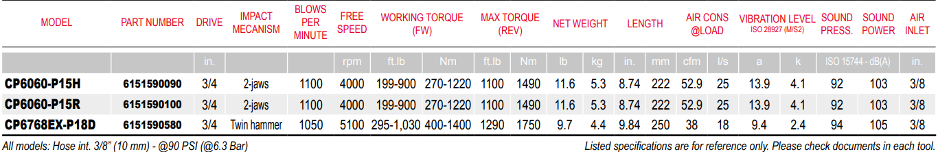 Type: Impact Wrench | Drive Size (in.): 3/4 | Impact Mecanism: Twin hammer | Blows Per Minute (BPM): 1050 | Free Speed (RPM): 5100 | Working Torque Range (fwd) (Nm): 400-1400 | Max Reverse Torque (ft-lbs): 1290 | Max Reverse Torque (Nm): 1750 | Length (in.): 9.84 | Length (mm): 250 | Air Consumption @ Load (CFM): 38 | Air Consumption @ Load (l/s): 18 | Vibration Level (a): 9.4 | Vibration Level (k): 2.4 | Sound Pressure (dbA): 94 | Sound Power (dbA): 105 | Air Inlet Size (in.): 3/8 | Min Hose Size (in.): 3/8 | Min Hose Size (mm): 10