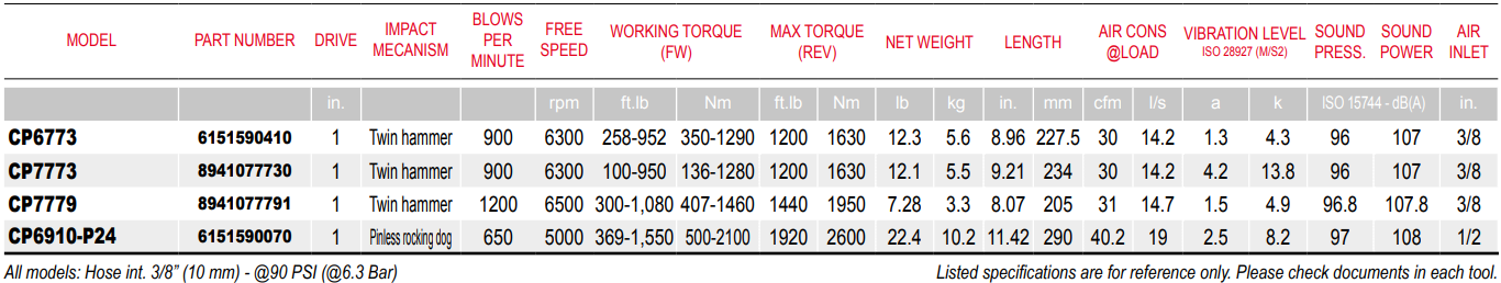 Type: Impact Wrench | Drive Size (in.): 1 | Impact Mecanism: Twin hammer | Blows Per Minute (BPM): 900 | Free Speed (RPM): 6300 | Working Torque Range (ft-lbs): 258-952 | Working Torque Range (fwd) (Nm): 350-1290 | Max Reverse Torque (ft-lbs): 1200 | Max Reverse Torque (Nm): 1630 | Length (in.): 8.96 | Length (mm): 227.5 | Air Consumption @ Load (CFM): 30 | Air Consumption @ Load (l/s): 14.2 | Vibration Level (a): 1.3 | Vibration Level (k): 4.3 | Sound Pressure (dbA): 96 | Sound Power (dbA): 107 | Air Inlet Size (in.): 3/8 | Min Hose Size (in.): 3/8 | Min Hose Size (mm): 10