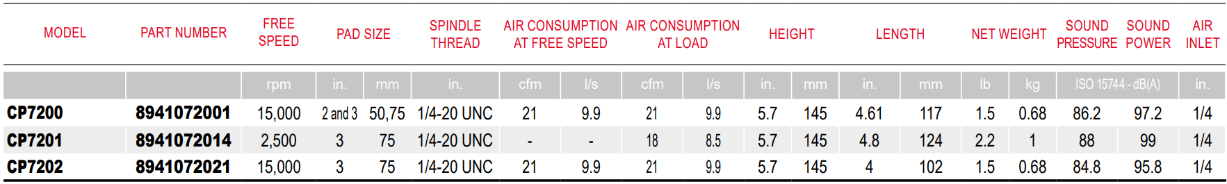 Type: Random Orbital Sander | Free Speed (RPM): 15000 | Length (in.): 4.61 | Length (mm): 117 | Air Consumption @ Free Speed (CFM): 21 | Air Consumption @ Free Speed (l/s): 9.9 | Air Consumption @ Load (CFM): 21 | Air Consumption @ Load (l/s): 9.9 | Sound Pressure (dbA): 86.2 | Sound Power (dbA): 97.2 | Air Inlet Size (in.): 1/4 | Pad Size (in.): 2 and 3 | Pad Size (mm): 50,75 | Spindle Thread (in.): 1/4-20 UNC | Min Hose Size (in.): 3/8 | Min Hose Size (mm): 10 | Height (In.): 5.7 | Height (mm): 145