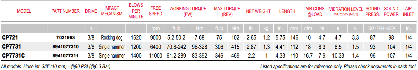 Type: Impact Wrench | Drive Size (in.): 3/8 | Impact Mechanism: Rocking dog | Blows Per Minute (BPM): 1620 | Free Speed (RPM): 9000 | Working Torque Range (fwd) (ft.lb): 5.2-50.2 | Working Torque Range (fwd) (Nm): 7-68 | Max Reverse Torque (ft-lbs): 75 | Max Reverse Torque (Nm): 102 | Length (in.): 5.75 | Length (mm): 146 | Air Consumption @ Load (CFM): 10 | Air Consumption @ Load (l/s): 4.7 | Vibration Level (a): 4.7 | Vibration Level (k): 3.3 | Sound Pressure (dbA): 87 | Sound Power (dbA): 98 | Air Inlet Size (in.): 1/4 | Min Hose Size (in.): 3/8 | Min Hose Size (mm): 10