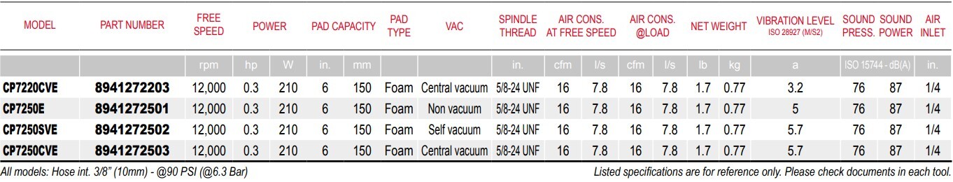 Type: Orbital Sander | Free Speed (RPM): 12000 | Air Consumption @ Free Speed (CFM): 16 | Air Consumption @ Free Speed (l/s): 7.8 | Air Consumption @ Load (CFM): 16 | Air Consumption @ Load (l/s): 7.8 | Vibration Level (a): 5 | Sound Pressure (dbA): 76 | Sound Power (dbA): 87 | Air Inlet Size (in.): 1/4 | Power (HP): 0.3 | Power (W): 210 | Pad Capacity (in.): 6 | Pad Capacity (mm): 150 | Pad Type: Foam | Vacuum: Non vacuum | Spindle Thread (in.): 5/8-24 UNF | Min Hose Size (in.): 3/8 | Min Hose Size (mm): 10