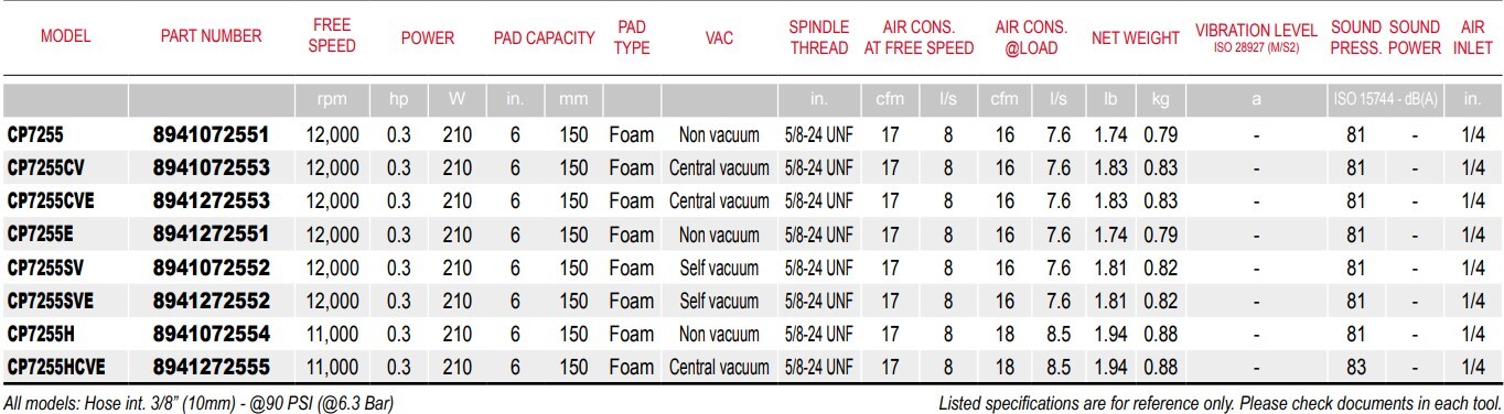 Type: Orbital Sander | Free Speed (RPM): 12000 | Air Consumption @ Free Speed (CFM): 17 | Air Consumption @ Free Speed (l/s): 8 | Air Consumption @ Load (CFM): 16 | Air Consumption @ Load (l/s): 7.6 | Sound Pressure (dbA): 81 | Air Inlet Size (in.): 1/4 | Power (HP): 0.3 | Power (W): 210 | Pad Capacity (in.): 6 | Pad Capacity (mm): 150 | Pad Type: Foam | Vacuum: Non vacuum | Spindle Thread (in.): 5/8-24 UNF | Min Hose Size (in.): 3/8 | Min Hose Size (mm): 10
