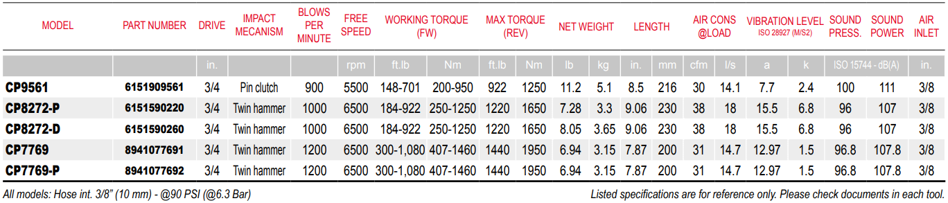 Type: Impact Wrench | Drive Size (in.): 3/4 | Impact Mecanism: Twin hammer | Blows Per Minute (BPM): 1200 | Free Speed (RPM): 6500 | Working Torque Range (ft-lbs): 300-1,080 | Working Torque Range (fwd) (Nm): 407-1460 | Max Reverse Torque (ft-lbs): 1440 | Max Reverse Torque (Nm): 1950 | Length (in.): 7.87 | Length (mm): 200 | Air Consumption @ Load (CFM): 31 | Air Consumption @ Load (l/s): 14.7 | Vibration Level (a): 12.97 | Vibration Level (k): 1.5 | Sound Pressure (dbA): 96.8 | Sound Power (dbA): 107.8 | Air Inlet Size (in.): 3/8 | Min Hose Size (in.): 3/8 | Min Hose Size (mm): 10