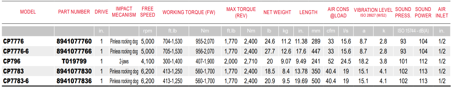 Type: Impact Wrench | Drive Size (in.): 1 | Impact Mechanism: Pinless rocking dog | Free Speed (RPM): 5000 | Working Torque Range (fwd) (ft-lbs): 705-1,530 | Working Torque Range (fwd) (Nm): 956-2,070 | Max Reverse Torque (ft-lbs): 1770 | Max Reverse Torque (Nm): 2400 | Length (in.): 17.6 | Length (mm): 447 | Air Consumption @ Load (CFM): 33 | Air Consumption @ Load (l/s): 15.6 | Vibration Level (a): 8.7 | Vibration Level (k): 2.8 | Sound Pressure (dbA): 93 | Sound Power (dbA): 104 | Air Inlet Size (in.): 1/2 | Min Hose Size (in.): 3/8 | Min Hose Size (mm): 10
