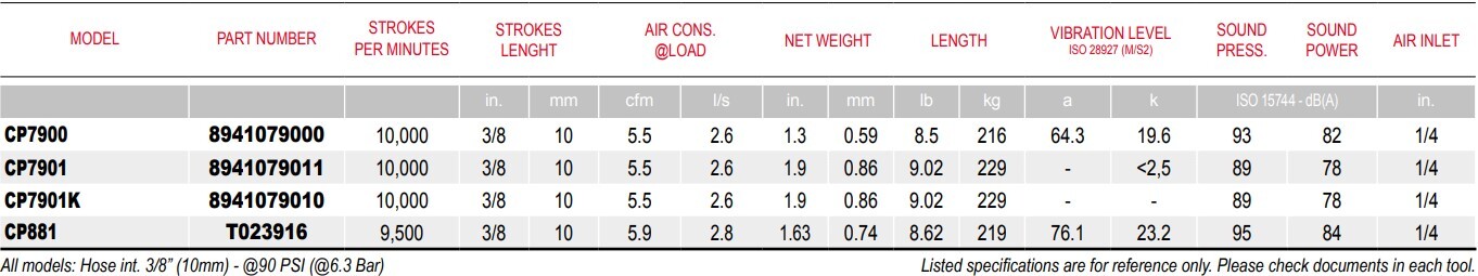 Type: Air Reciprocating Saw | Length (in.): 9.02 | Length (mm): 229 | Air Consumption @ Load (CFM): 5.5 | Air Consumption @ Load (l/s): 2.6 | Vibration Level (k): <2.5 | Sound Pressure (dbA): 89 | Sound Power (dbA): 78 | Air Inlet Size (in.): 1/4 | Stroke Length (in.): 3/8 | Stroke Length (mm): 10 | Strokes Per Minute: 10000 | Min Hose Size (in.): 3/8 | Min Hose Size (mm): 10