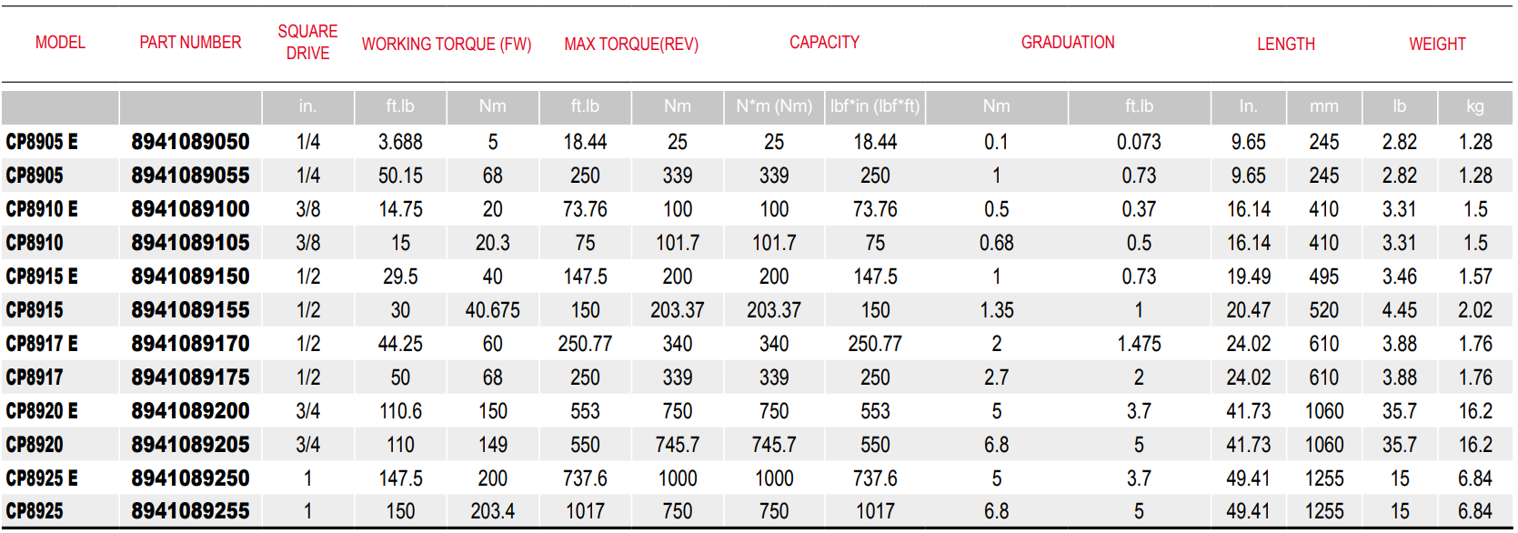 Chicago Pneumatic CP8925 Torque Wrench is one of the most robust torque wrenches in its class. Its incredible robustness and high accuracy allow it to secure the job well. Designed with long-lasting accuracy, at 4% according to the EN ISO 6789:2003 standard and up to 25,000 cycles, it is one of the most durable and reliable torque wrenches for general mechanics and tire-changing applications. Its compact design enables the user to work in restricted areas. Chicago Pneumatic 8941089255 Torque Wrench comes with easy and precise torque adjustment with manual locking in front of the handle, maximizing operator comfort. The black aluminum handle is resistant to common chemicals found in workshops.