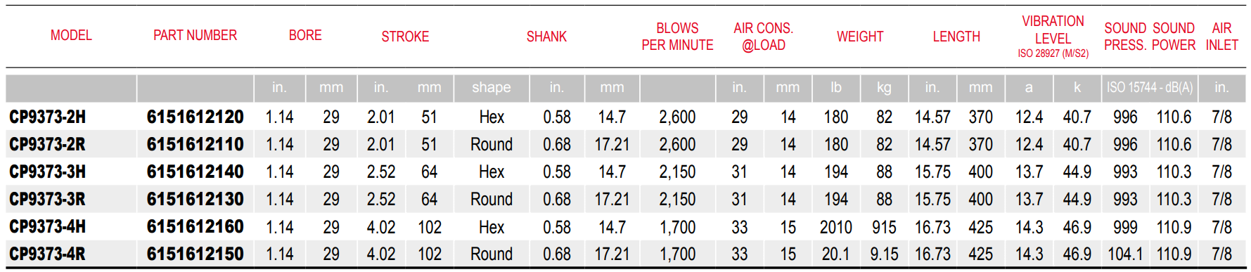 Type: Chipping Hammer | Blows Per Minute (BPM): 2600 | Length (in.): 14.57 | Length (mm): 370 | Vibration Level (a): 12.4 | Vibration Level (k): 40.7 | Sound Pressure (dbA): 996 | Sound Power (dbA): 110.6 | Air Inlet Size (in.): 7/8 | Bore (in.): 1.14 | Bore (mm): 29 | Stroke (in.): 2.01 | Stroke (mm): 51 | Min Hose Size (in.): 3/8 | Min Hose Size (mm): 10 | Shank Shape: Hex | Shank (in.): 0.58 | Shank (mm): 14.7