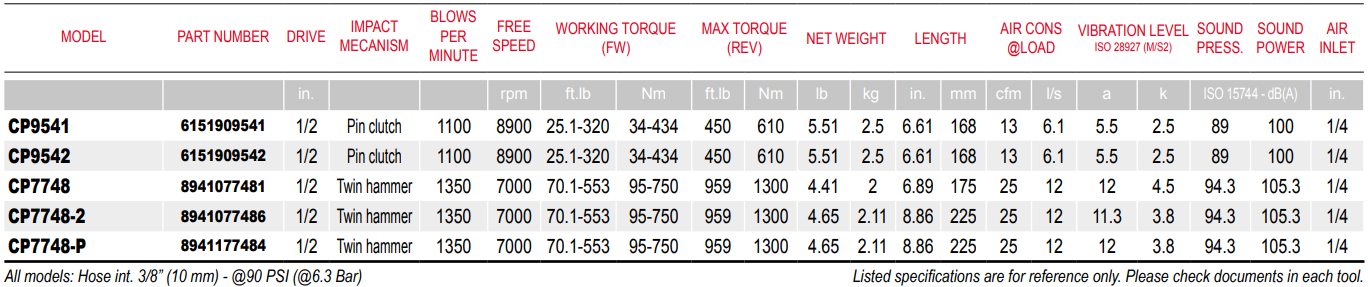 Type: Impact Wrench | Drive Size (in.): 1/2 | Impact Mecanism: Pin clutch | Blows Per Minute (BPM): 1100 | Free Speed (RPM): 8900 | Working Torque Range (ft-lbs): 25.1-320 | Working Torque Range (fwd) (Nm): 34-434 | Max Reverse Torque (ft-lbs): 450 | Max Reverse Torque (Nm): 610 | Length (in.): 6.61 | Length (mm): 168 | Air Consumption @ Load (CFM): 13 | Air Consumption @ Load (l/s): 6.1 | Vibration Level (a): 5.5 | Vibration Level (k): 2.5 | Sound Pressure (dbA): 89 | Sound Power (dbA): 100 | Air Inlet Size (in.): 1/4 | Min Hose Size (in.): 3/8 | Min Hose Size (mm): 10