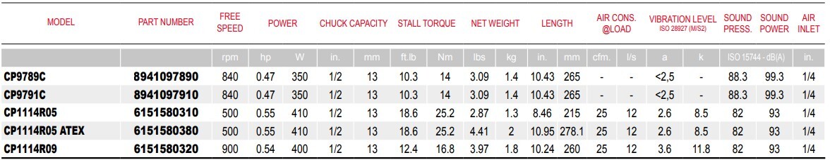 Type: Drill | Free Speed (RPM): 840 | Length (in.): 10.43 | Length (mm): 265 | Vibration Level (a): <2.5 | Sound Pressure (dbA): 88.3 | Sound Power (dbA): 99.3 | Air Inlet Size (in.): 1/4 | Power (HP): 0.47 | Power (W): 350 | Collet Capacity (in.): 1/2 | Collet Capacity (mm): 13 | Min Hose Size (in.): 3/8 | Min Hose Size (mm): 10 | Stall Torque (ft-lbs): 10.3 | Stall Torque (Nm): 14
