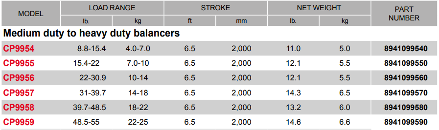 Chicago Pneumatic CP9959 Medium to Heavy Duty Balancer is a culmination of decades of research and technical refinement. Chicago Pneumatic tools are reliable, safe and robust, thus help saving time and money. These tools eliminate stress and fatigue and help to improve productivity. Chicago Pneumatic 8941099590 Balancer is the most common safety device that prevents load dropping due to spring breakage. The balancer extends or retracts the support cable to follow the tool's movements. The assembler can reposition the tool while experiencing comfortable operation. This Conical Shape CP9959 Balancer features an upper suspension with a rotary safety hook which reduces the risk of musculoskeletal injuries in tool operators by supporting the tool. It also features precision guided cable winding that prevents jamming and anti-friction cable guide. 8941099590 Medium to Heavy Duty Balancer is one of the best floor-controlled locking device for instant manual clamping or release and features a worm screw capacity adjustment and spring drum assembly.