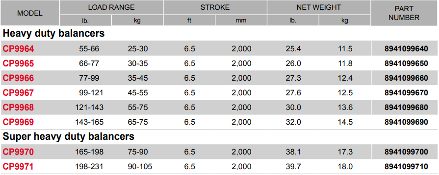 Chicago Pneumatic CP9971 Super Heavy Duty Balancer is a culmination of decades of research and technical refinement. Chicago Pneumatic tools are reliable, safe and robust, thus help saving time and money. These tools eliminate stress and fatigue and help to improve productivity. Chicago Pneumatic 8941099710 Balancer is the most common safety device that prevents load dropping due to spring breakage. The balancer extends or retracts the support cable to follow the tool's movements. The assembler can reposition the tool while experiencing comfortable operation. This Conical Shape CP9971 Balancer features an upper suspension with a rotary safety hook which reduces the risk of musculoskeletal injuries in tool operators by supporting the tool. It also features precision guided cable winding that prevents jamming and anti-friction cable guide. 8941099710 Super Heavy Duty Balancer is one of the best floor-controlled locking device for instant manual clamping or release and features a worm screw capacity adjustment and spring drum assembly.
