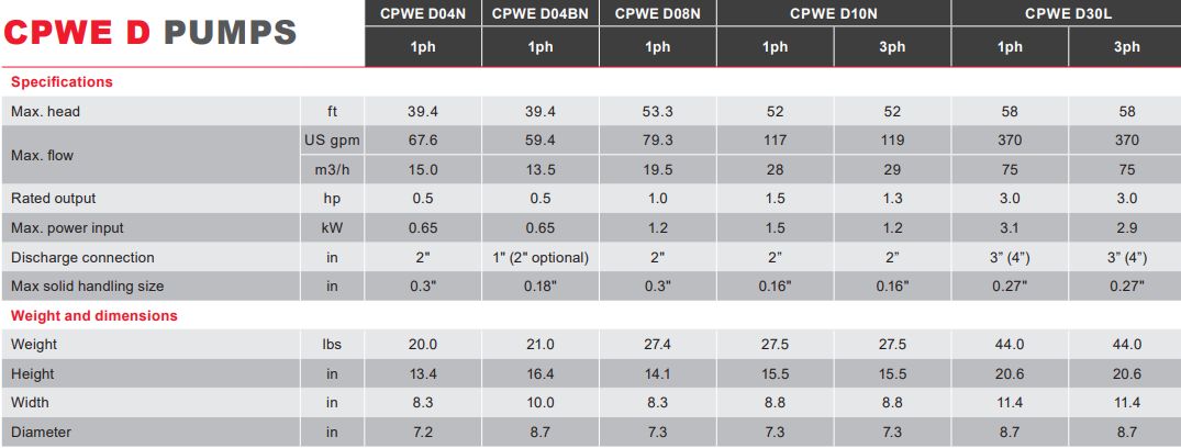 2-inch discharge connections, the CPWE D08N handles solids up to 0.3 inches in size, making it suitable for use in construction sites, industrial plants, and agricultural fields. The pump’s robust housing and corrosion-resistant components allow it to withstand harsh conditions while maintaining consistent performance.