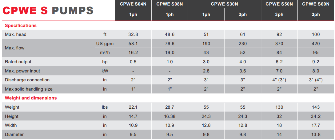 The CPWE S04N is built for submersion and tight access. The pump unit measures 14.7 inches in height and 10.9 inches in width, with a diameter of 9.5 inches. This relatively narrow diameter allows it to fit into small sumps, trenches, and manholes. It is equipped with a 2-inch discharge connection for efficient removal of water and liquids. Importantly, it is capable of handling solids up to 1 inch in size, making it suitable for pumping dirty water that may contain small debris, though it is not intended for the high solid content of a dedicated sludge pump. The balance of its low-weight portability (22.1 lbs) and respectable performance (32.8 ft heads) makes it an excellent choice for contractors requiring a powerful, yet manageable, pump for various dewatering tasks, such as draining excavations, basements, and sumps where moderate amounts of solids may be present.