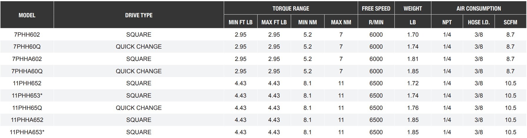 Type: Pulse Tool | Drive Type: Square | Torque Range (ft-lbs): 4.43 - 4.43 | Torque Range (Nm): 8.1 - 11 | Free Speed (RPM): 6500 | Air Inlet NPT (in.): 1/4 | Hose ID (in.): 3/8 | Air Consumption (SCFM): 10.5