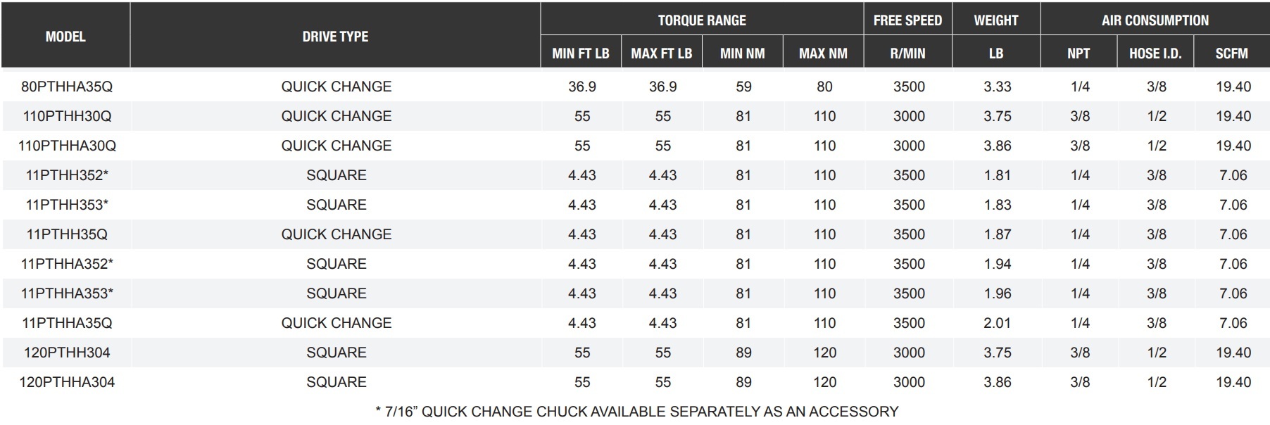- Inertia shut-off, a low noise level, an efficient 3-chamber air motor, external speed control, and oil-less blades, reversible torque signal port